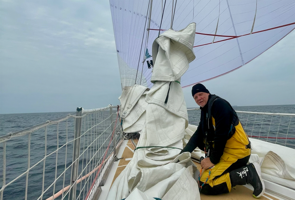So when the kite is coming down, it threads over the boom and straight through my outstretched arms. My job is to compress it—force it into tight folds and prevent any air from getting back into it. Because if it fills again, even partially, it can generate enough force to rip the sail back out, overpower the crew on the line, or pull someone off the deck and into the water. So the job is simple in theory: kill the air and control the sail. In practice, it’s a wrestling match with a living thing.