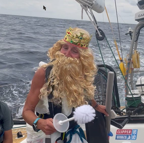 Just as we left the ITCZ, a tactical misstep earned us a six-hour penalty that hung over our head for the rest of the race. Then, on September 30, we crossed the Equator—and I finally transitioned from pollywog to shellback. It’s an old maritime tradition: when a sailor crosses the equator for the first time, King Neptune himself comes aboard to conduct the ceremony. Decades ago, when I served in the Navy, my ship was scheduled to cross but was recalled before it happened. It took nearly forty years, but I finally earned the title.